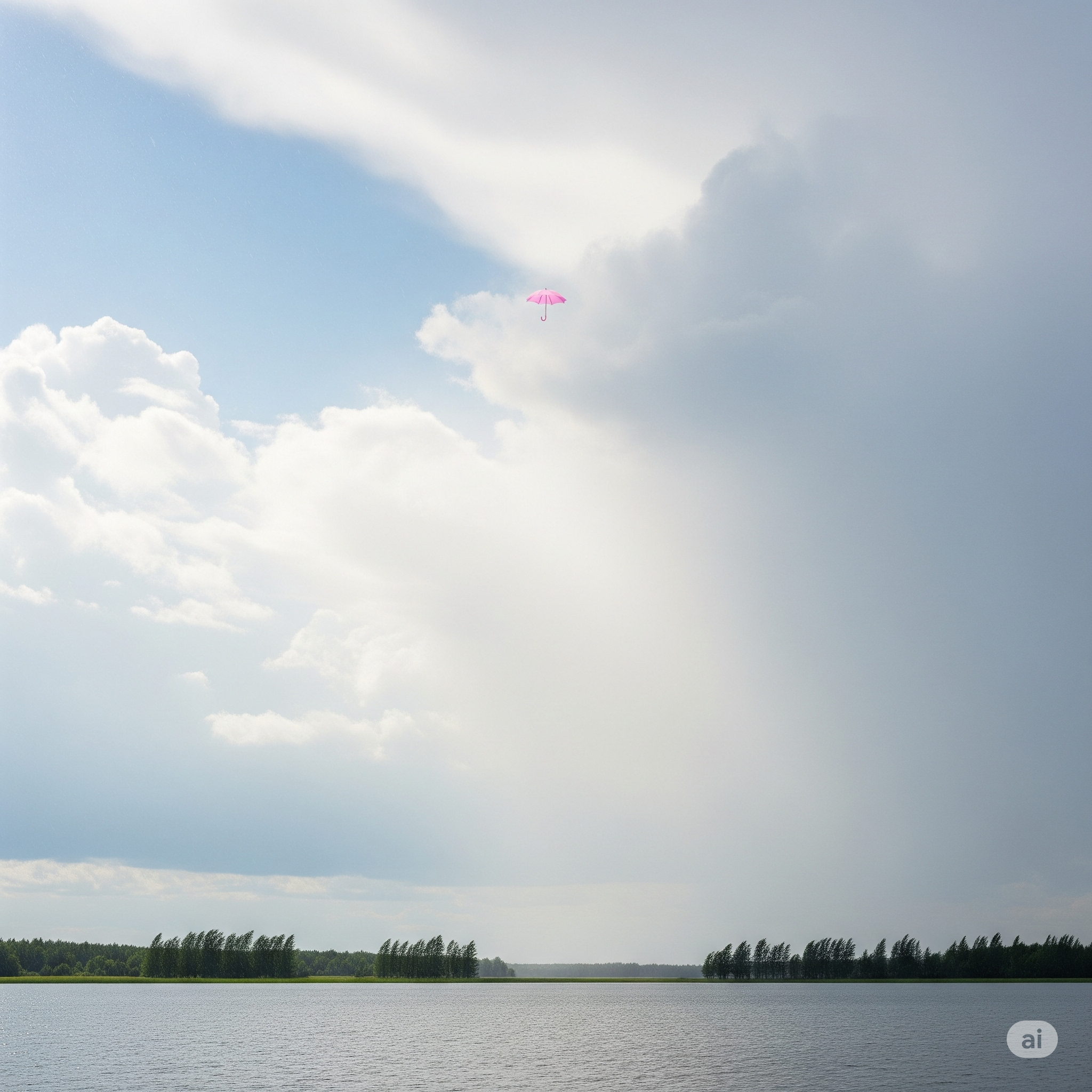 A pink umbrella falling from the sky over a lake with trees in the background, under a cloudy sky.